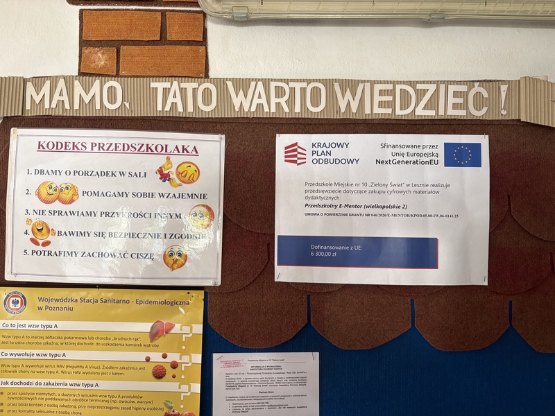 21.04.2026 (wtorek) - grupa V Pszczółki godz. 9.15 22.04.2026 (środa) - grupa III Słoneczka godz. 9.15 23.04.2026 (czwartek) - grupa II Jeżyki godz. 9.15 24.04.2026 (piątek) - grupa I Kubusie godz. 9.15 27.04.2026 (poniedziałek) - grupa IV Motylki godz. 9.15 Po zajęciach w grupach Motylki i Pszczółki, przekażemy rodzicom informacje o gotowości dziecka do podjęcia nauki w szkole podstawowej. Aleksandra Matuszewska jest studentką ostatniego roku dietetyki na Uniwersytecie Przyrodniczym w Poznaniu. Pisze pracę magisterską, prowadzi badanie oceniające sposób żywienia dzieci w przedszkolach. W związku z tym potrzebuje opinii rodziców na ten temat. Bardzo prosimy o wypełnienie ankiety. Jest ona anonimowa. Dla Państwa to chwilka a ogromna pomoc 😉 Dziękujemy bardzo! 😉 Kliknij link do ankiety 09.04. 2026r (czwartek) od godz. 11.00 odbędzie się sesja zdjęciowa w togach dla dzieci 6 letnich odchodzących do szkoły. To świetny pomysł, aby uwiecznić te ważne chwile w formie foto-książki! Zrobione zostanie zdjęcie grupowe (Motylki, Pszczółki) oraz zdjęcia dzieci 5letnich. Jeśli ktoś z rodziców dzieci 5l będzie chciał zamówić taką foto-książkę prosimy o wcześniejsze zgłoszenie w grupie. Prosimy rodziców o ubrane dzieci w tym dniu na galowo. Cena foto-książki 86 zł. Nasze Przedszkole uzyskało Grant, który został sfinansowany przez Unię Europejską w ramach projektu "Cyfrowe Przedszkole" E-Mentor ![]() Fundacja Studencka „Młodzi-Młodym” powstała w 2006 roku. Działa na terenie całej Polski. Od samego początku pomaga młodym ludziom w realizacji ich marzeń, a także jednostkom organizacyjnym zdobywać środki w postaci dodatkowych funduszy. Organizacja ta wspiera wszelkie działania organizacyjne mogące umożliwić rozwój i modernizację między innymi szkół, przedszkoli. Jak przekazać 1,5% podatku – na podstawie druku PIT – 37. Darmowy program do PIT oraz poradnik znajdą państwo na www.fsmm.pl. Nasze przedszkole współpracuje z Fundacją Studencką „Młodzi-Młodym” dlatego też Drodzy Rodzice, dziadkowie, przyjaciele przedszkola! Prosimy o przekazywanie 1,5% podatku dochodowego za rok 2025. Podczas wypełniania formularza PIT 37 prosimy o wpisanie KRS: 0000270261 oraz poniższy cel szczegółowy ZIELONY ŚWIAT LESZNO 6223 Taka forma wsparcia niestanowiąca dla Państwa dodatkowego obciążenia finansowego, będzie dla nas ogromną pomocą. Zebrane pieniądze będą przeznaczone na dalsze zmodernizowanie terenów zielonych naszego przedszkola, dalsze odnowienie sal przedszkolnych. Z dotychczasowo uzbieranych pieniędzy udało nam się zakupić rolety do 3 sal przedszkolnych, upiększyć teren zielony, zakupić kamienie do wysypania przy roślinach zielonych, zakupić domek ogrodowy na sprzęt potrzebny do pielęgnacji placu oraz do przechowania zabawek ogrodowych i rowerków dla dzieci. To dzięki Wam drodzy darczyńcy stworzyliśmy dzieciom ładniejsze i schludniejsze miejsca pracy i zabawy, oraz piękniejszy teren zielony wokół naszego przedszkola, który jest też wizytówką naszej placówki. Kwota, którą państwo przekażecie w postaci 1,5% zostanie wpłacona na lokatę. Pragniemy podziękować wszystkim rodzicom, dziadkom oraz ludziom dobrej woli za dotychczasowe wsparcie poprzez przekazanie podatku i prosimy abyście pamiętali o Nas i w tym roku. Każdy 1,5% ma znaczenie i przybliża nas do obranego celu. Zachęcamy Państwa do wsparcia naszej akcji. Informujemy,